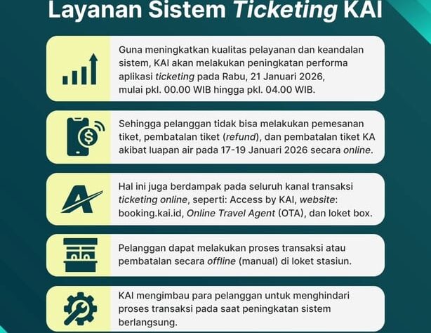 Bandung (Jawa Barat), 20 Januari 2026 – PT Kereta Api Indonesia (Persero) akan melakukan migrasi dan penguatan kapasitas Rail Ticketing System (RTS) pada Rabu, 21 Januari 2026, pukul 00.00 hingga 04.00 WIB. Langkah ini mencakup seluruh sistem pemesanan tiket, baik Kereta Api Jarak Jauh (KAJJ) maupun KA Lokal (KAI & KAI Commuter), guna memastikan keandalan layanan menjelang masa Angkutan Lebaran.