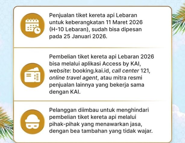 Masa Liburan Lebaran 2026 kian mendekat. Melalui skema pemesanan H-45, PT Kereta Api Indonesia (Persero) membuka penjualan tiket kereta api secara bertahap, sehingga masyarakat yang melakukan pemesanan pada 25 Januari 2026 sudah dapat merencanakan perjalanan untuk keberangkatan mulai 11 Maret 2026.