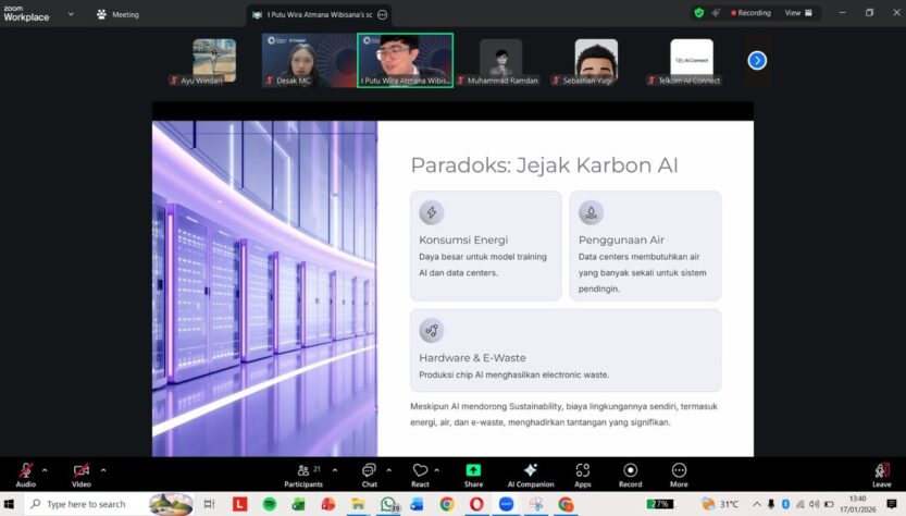 Telkom AI Center Bali menyelenggarakan AI Connect Online Series dengan tema “The Intersection of Sustainability and AI” pada Sabtu (17/1). Kegiatan yang digelar secara daring melalui Zoom Meeting ini berlangsung selama kurang lebih tiga jam dan diikuti oleh peserta dari berbagai latar belakang profesional, mulai dari pelaku industri digital, praktisi teknologi, hingga pemerhati isu keberlanjutan.